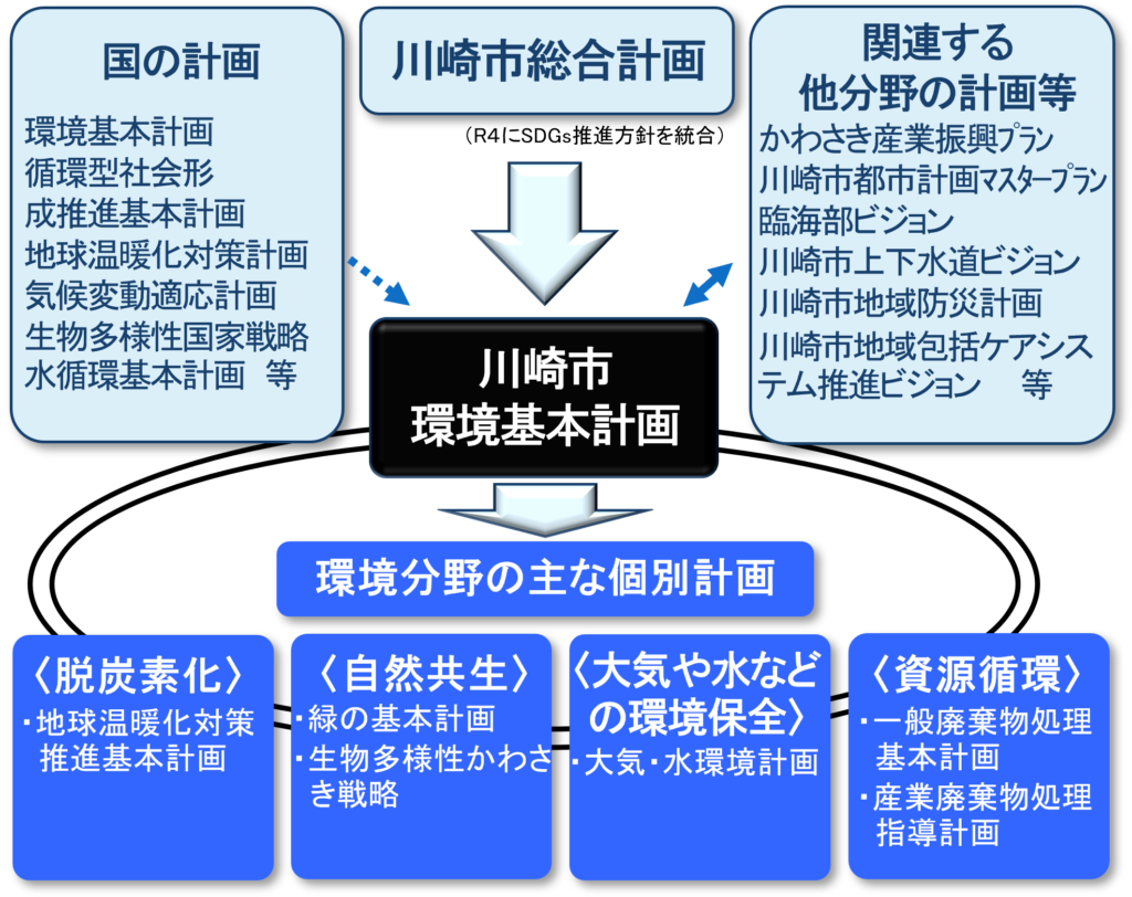 環境分野の個別計画の上位に位置づけられるとともに、川崎市総合計画(以下「市総合計画」)で定めるめざす都市像を環境面から実現していく役割を担っています。