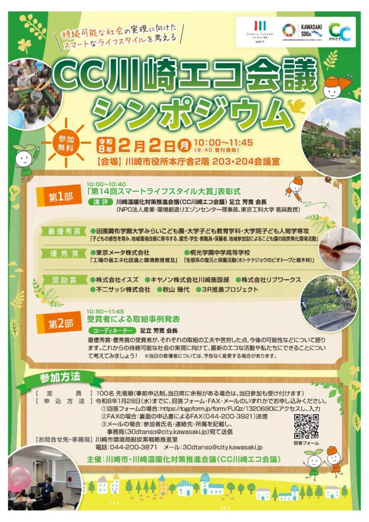 CC川崎エコ会議シンポジウムとして、川崎市でCO2削減に貢献する優れた取組を表彰する「第14回スマートライフスタイル大賞」表彰式と受賞団体による取組事例の発表を行います。