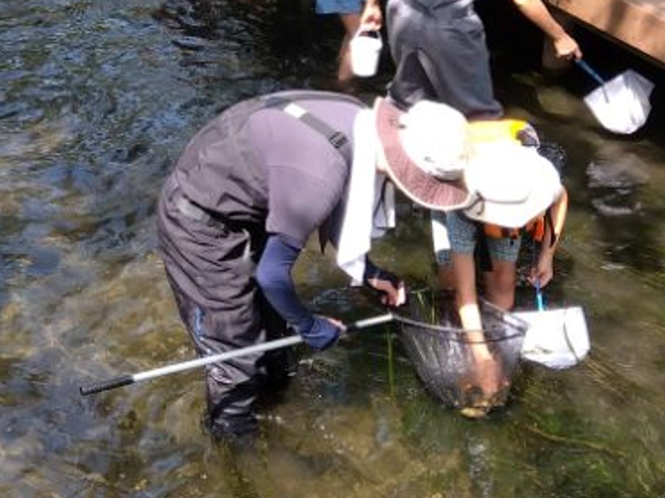 それぞれ湧水地や川に生息する生きものの観察など水辺に親しむ体験をします!