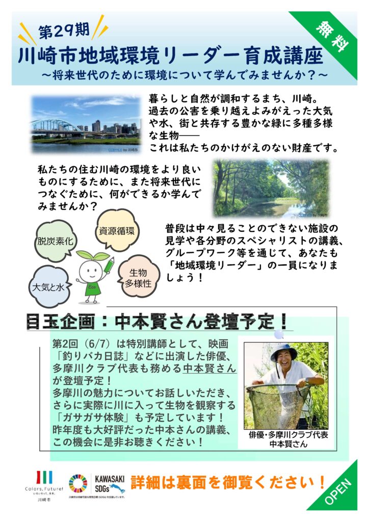 今年も第2回(6月7日)の講座では特別講師として、多摩川で長年にわたり環境保全活動に御尽力いただいている俳優の中本賢さん(多摩川クラブ代表)が登壇予定︕