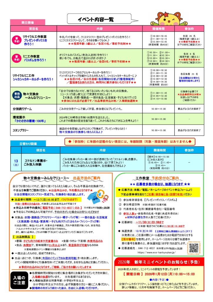 王禅寺エコ暮らし環境館では「クリスマス環境教室」を開催します。工作やゲームなどを通じて、ごみ処理施設や身近な環境問題について楽しく学べるイベントです。牛乳パックを使ってプレゼントボックスを作る工作教室、施設内でのスタンプラリー、スケルトン車の展示、分別釣りゲーム、物々交換会などを様々なイベントを行います。事前予約が必要なものがありますので、お気軽に問い合わせください。