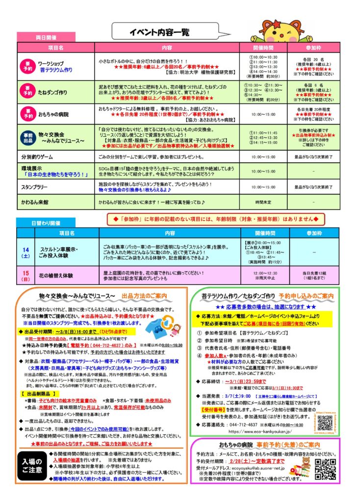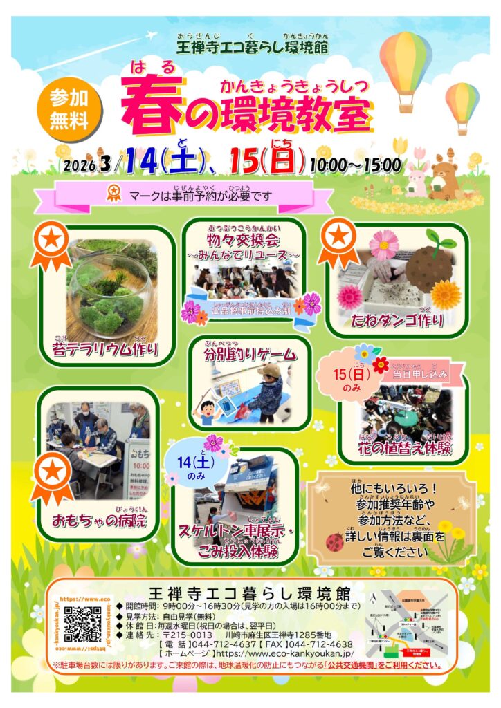 王禅寺エコ暮らし環境館では「春の環境教室」を開催します。工作やゲームなどを通じて、ごみ処理施設や身近な環境問題について楽しく学べるイベントです。苔テラリウム作り、たねダンゴ作り、施設内でのスタンプラリー、スケルトン車の展示、分別釣りゲーム、花の植替え体験など様々なイベントを行います。事前予約が必要なものがありますので、お気軽に問い合わせください。
